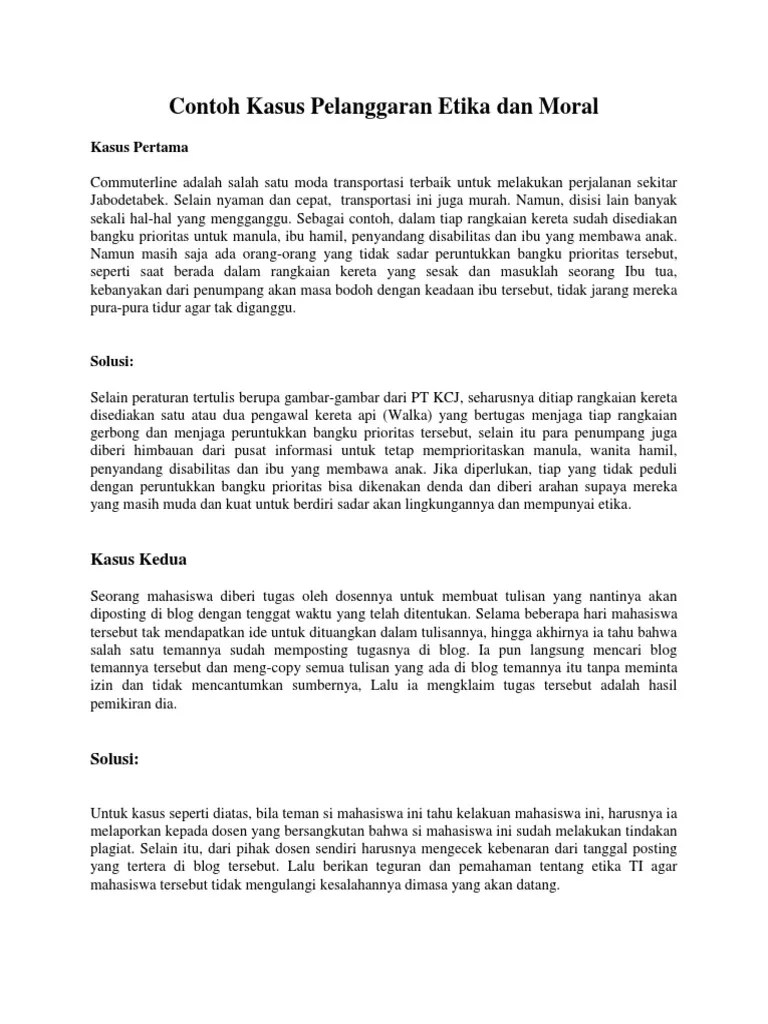 Mengalahkan berlakunya norma moral (akhlak). Contoh lain profesi hukum adalah dalam bidang kehakiman, kejaksaan dan lain sebagainya. Setiap profesional hukum dituntut agar memiliki nilai moral yang kuat. Moral merupakan bagian dari nilai. Moral merupakan nilai tatanan baik buruk prilaku manusia, dengan moral manusia diharapkan mempunyai tata bahasa dan prilaku yang baik di kalangan masyarakat. Berdasarkan beberapa contoh kasus diatas menujukkan bahwa phk. Moral erat kaitannya dengan akhlak yang mengandung makna tata tertib yang datang dari hati nurani manusia. Masih banyak contoh yang membuktikan bahwa moralitas merupakan hukum yang universal. Namun juga harus melihat dari aspek nilai moral dan etika yang ada di. Salah satu contoh makalah manusia, nilai, moral dan hukum pada mata. Dengan memecahkan suatu kasus dalam permasalahan yang terjadi dan . (analisis kasus nikah sirri dan singkat bupati garut)*.