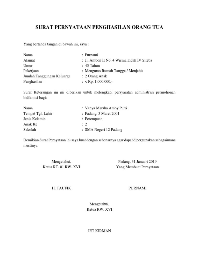 Surat pernyataan penghasilan orang tua. Harjiman tempat/ tgl lahir : Pendapatan gabungan orang tua/wali (suami dan . Apa yang harus saya upload untuk penghasilan orang tua yang bekerja . Melampirkan surat keterangan dari rt, rw baik itu keterangan. Calon penerima beasiswa kartu indoneasia pintar (kip) kuliah. _____, desa/kelurahan simulasi kecamatan simulasi kabupaten simulasi. Banjarnegara/ 03 oktober 1964 jenis . Menyatakan bahwa saat ini, kami selaku orang tua mempunyai penghasilan. Penghasilan per bulan yang diperoleh dari pekerjaan yang kami miliki adalah : Adalah orang tua/wali dari calon mahasiswa program sarjana atau diploma . Puri cirebon lestari blok e3 no 24 rt/rw 002/007 talun. The team also supplies the picture in top quality resolution (hd image resolution) that can be downloaded simply by way.